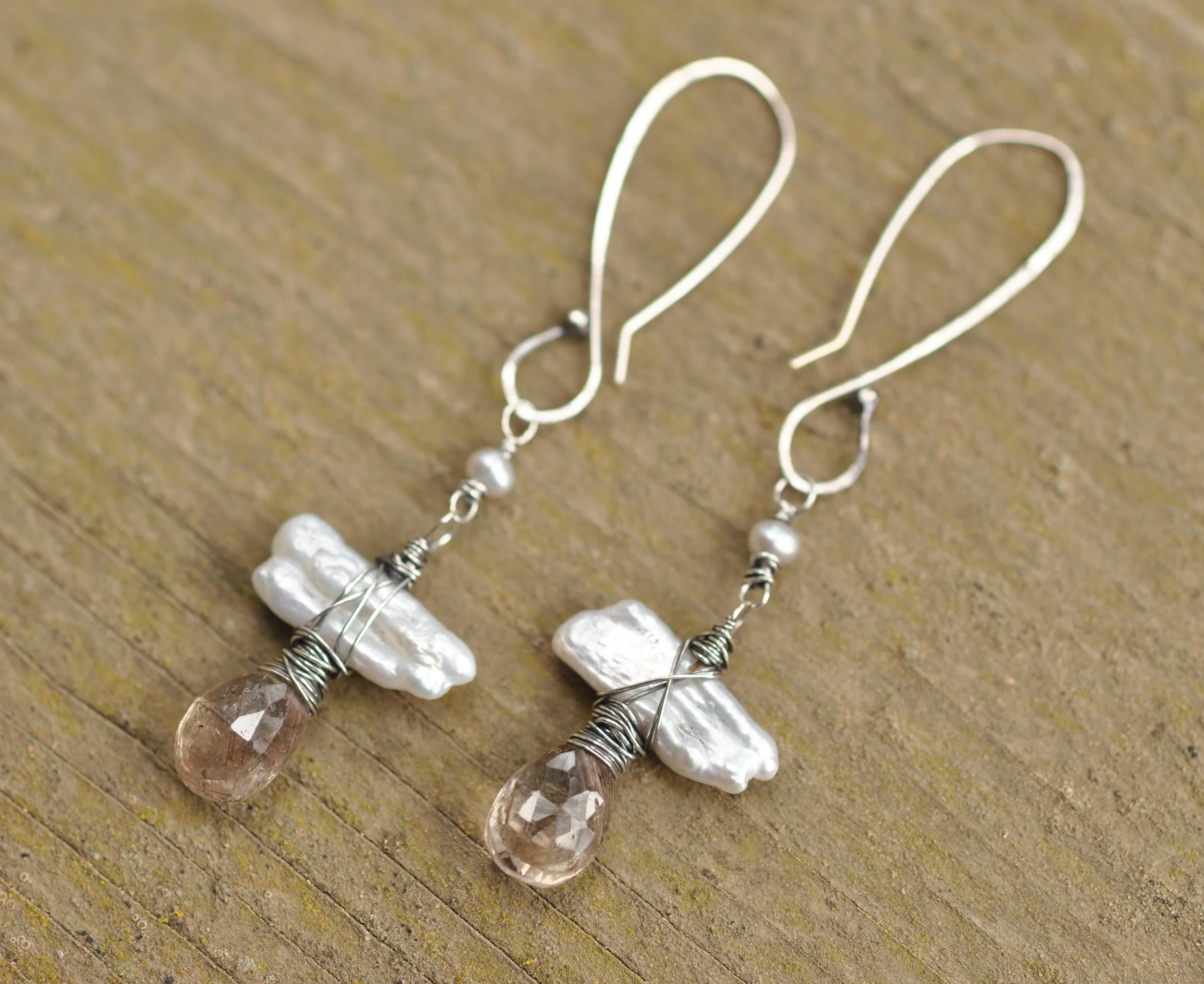 Biwa Pearl and Copper Rutile Earrings - $85